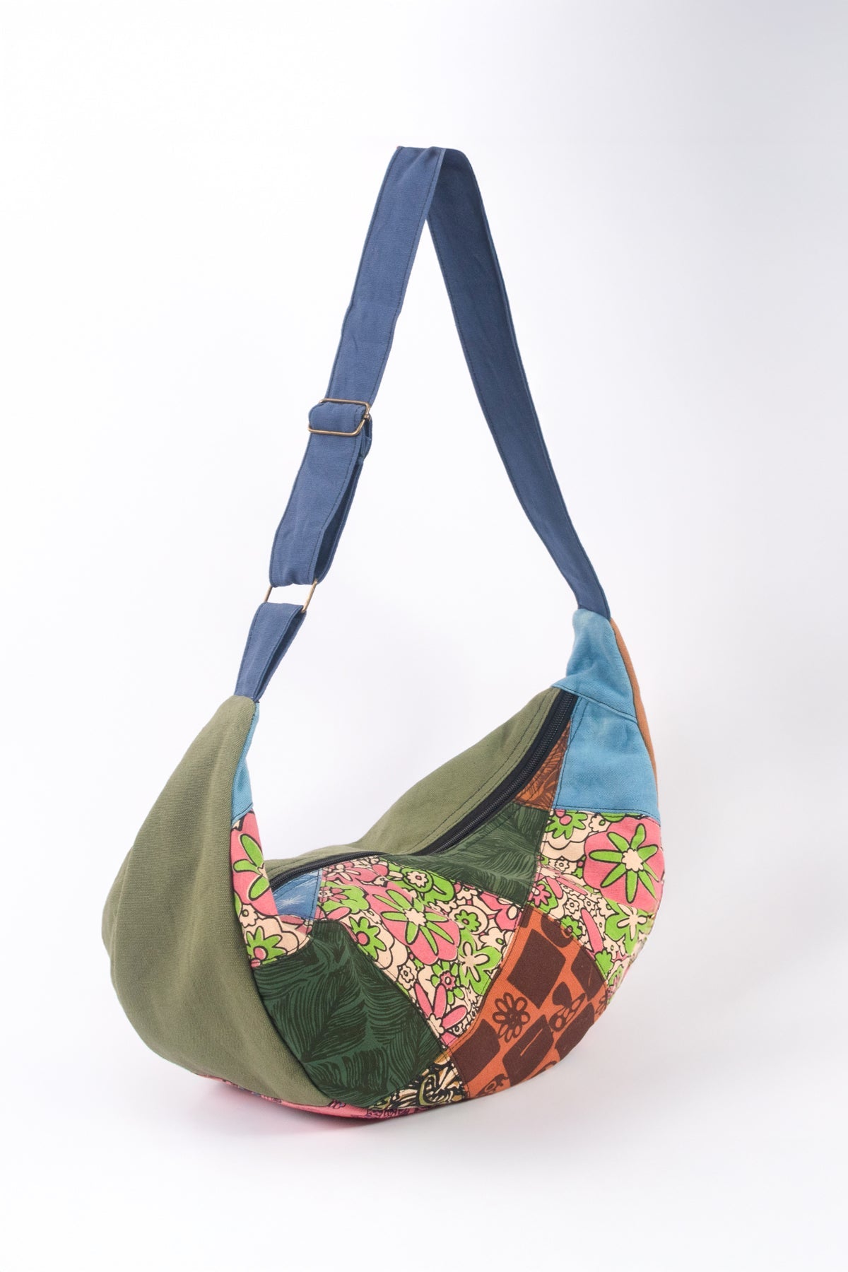 This crescent-shaped crossbody bag is made from upcycled patchwork cotton canvas and designed for casual outings or everyday wear. It features a spacious main compartment, soft poly-cotton lining, and an adjustable strap for comfortable carry. Each piece is unique in color and print.