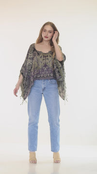 The Fringe Paisley Shawl Top features a flowing poncho-style design with an intricate paisley print and elegant fringe trim. Crafted from lightweight viscose, this versatile piece drapes beautifully and offers a comfortable, relaxed fit. Perfect for layering over casual outfits, adding a bohemian flair to beachwear, or styling for festivals and summer evenings. Available in Olive and Lavender for a touch of earthy or soft pastel charm.