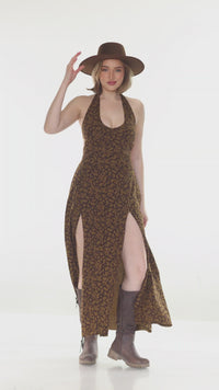 This effortlessly elegant printed maxi dress features a flattering halter neckline and a flowing, full-length silhouette designed to move beautifully with the body. Crafted from breathable cotton, the dress showcases an allover subtle print that adds visual texture while keeping the look timeless and versatile. A dramatic side slit enhances ease of movement and adds a touch of allure, making this piece perfect for warm days, vacations, or dressed-up casual occasions.