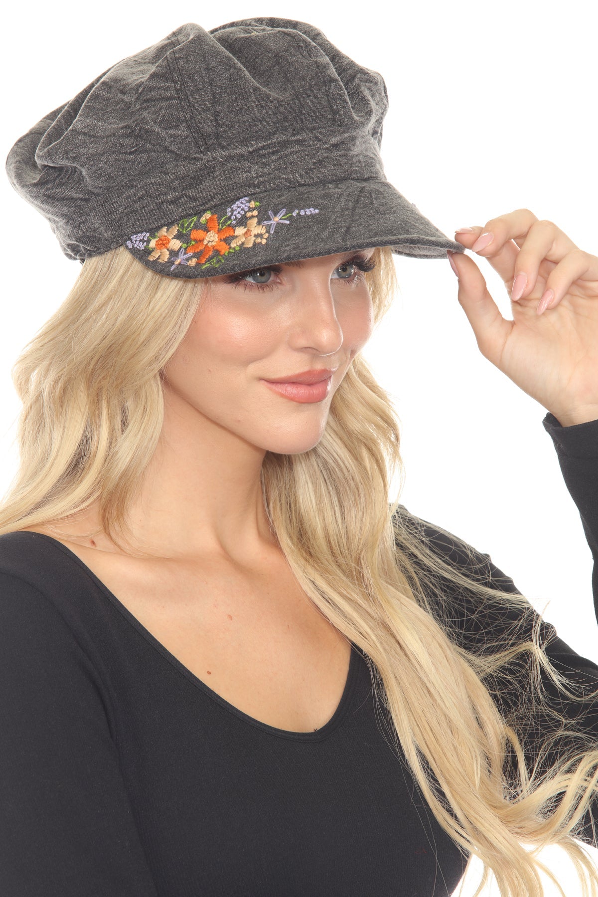 Add a touch of vintage charm to your look with the Stonewashed Embroidered Newsboy Cap. Crafted from soft, durable cotton, this cap features beautiful tonal embroidery on the side for an artisanal touch. The stonewashed finish gives it a lived-in, timeless appeal, while the structured crown and curved brim provide both style and sun protection. Perfect for casual outings, festivals, or adding a unique accessory to your everyday wardrobe.
