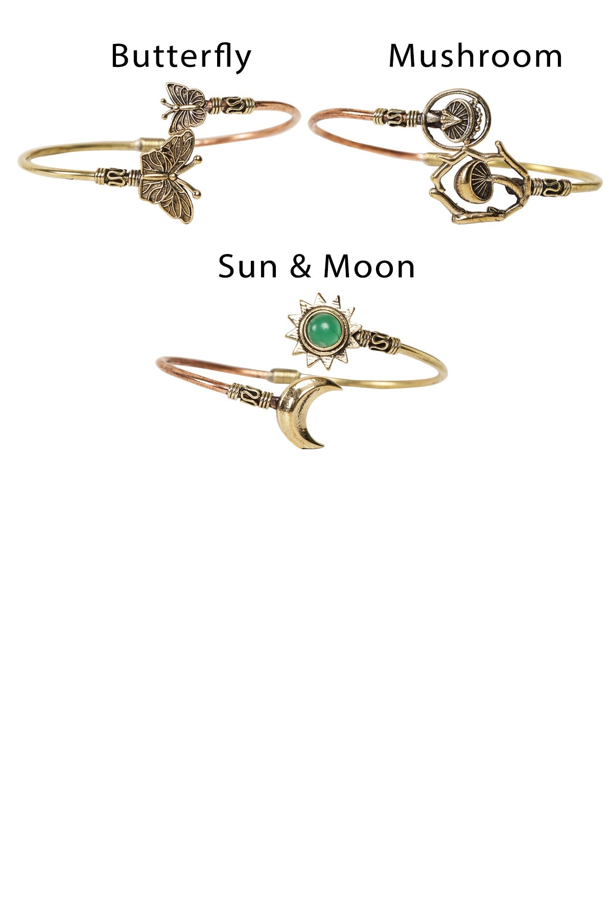 These Brass Charm Cuff Bracelets feature intricate designs including Mushroom, Sun & Moon, and Butterfly motifs, adding a touch of bohemian elegance to any outfit. Made from durable, lead-free brass, each cuff is adjustable for a comfortable fit. Perfect for stacking or wearing solo, these unique pieces bring a whimsical and earthy charm to your accessory collection.
