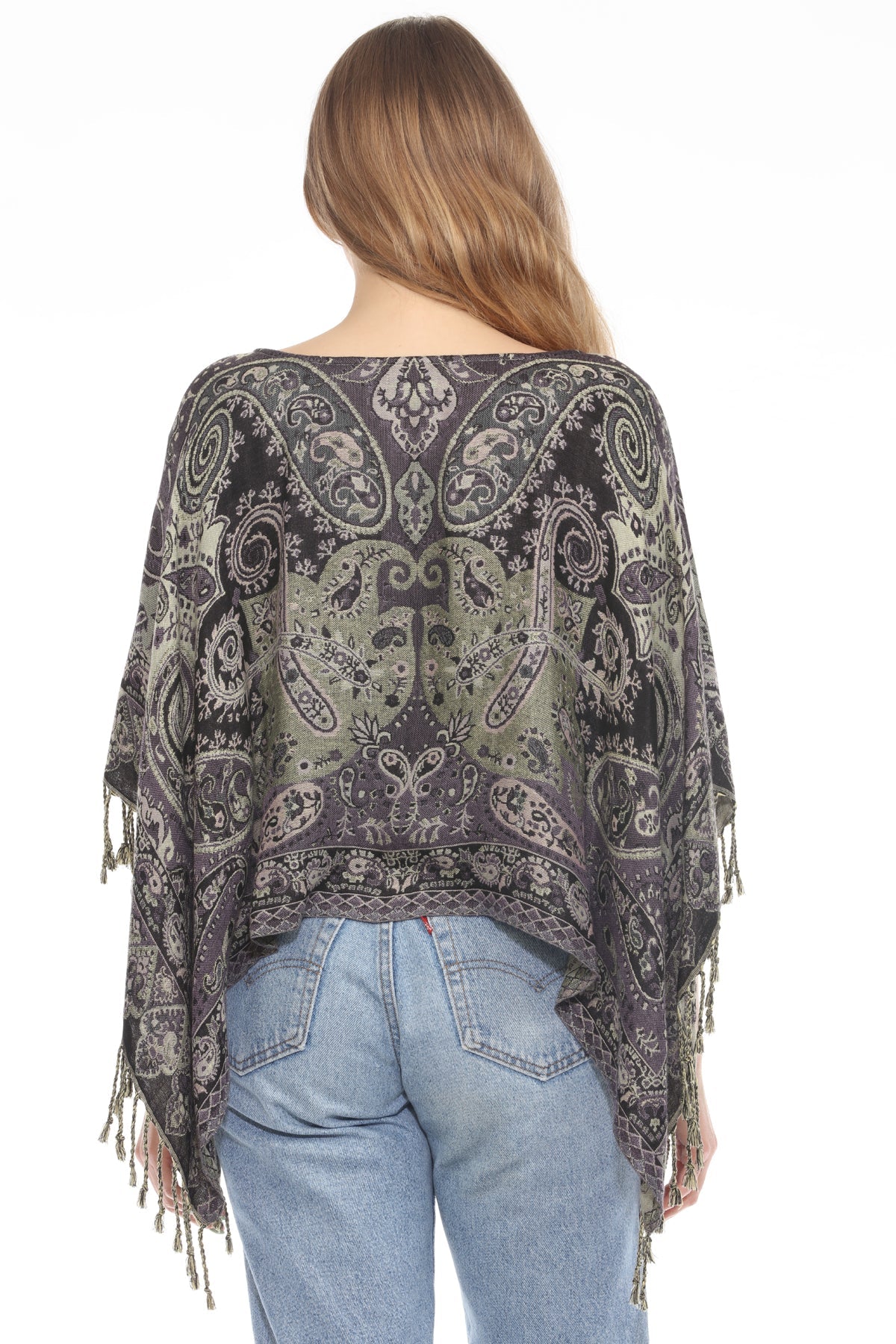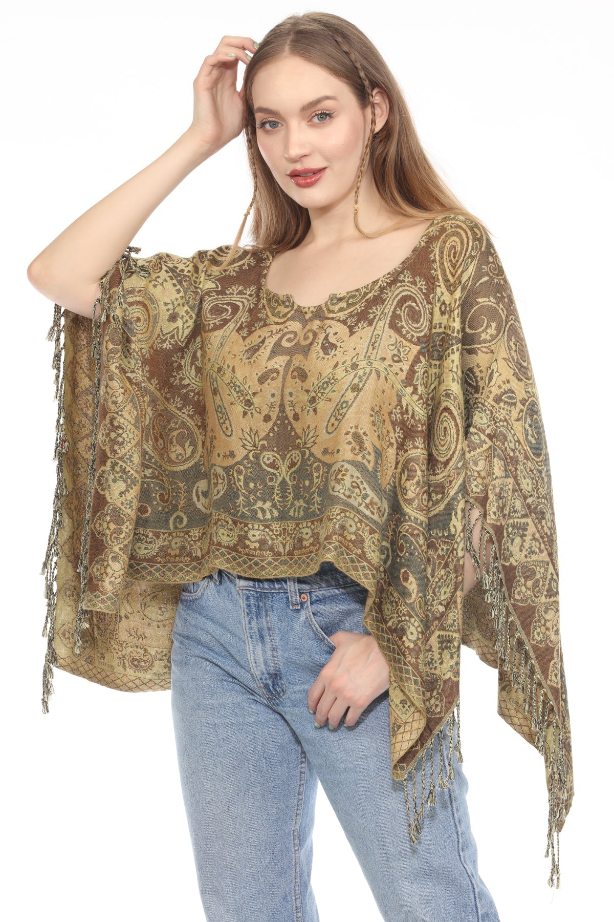 The Fringe Paisley Shawl Top features a flowing poncho-style design with an intricate paisley print and elegant fringe trim. Crafted from lightweight viscose, this versatile piece drapes beautifully and offers a comfortable, relaxed fit. Perfect for layering over casual outfits, adding a bohemian flair to beachwear, or styling for festivals and summer evenings. Available in Olive and Lavender for a touch of earthy or soft pastel charm.