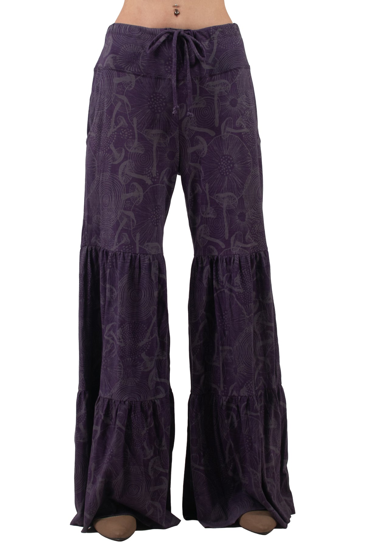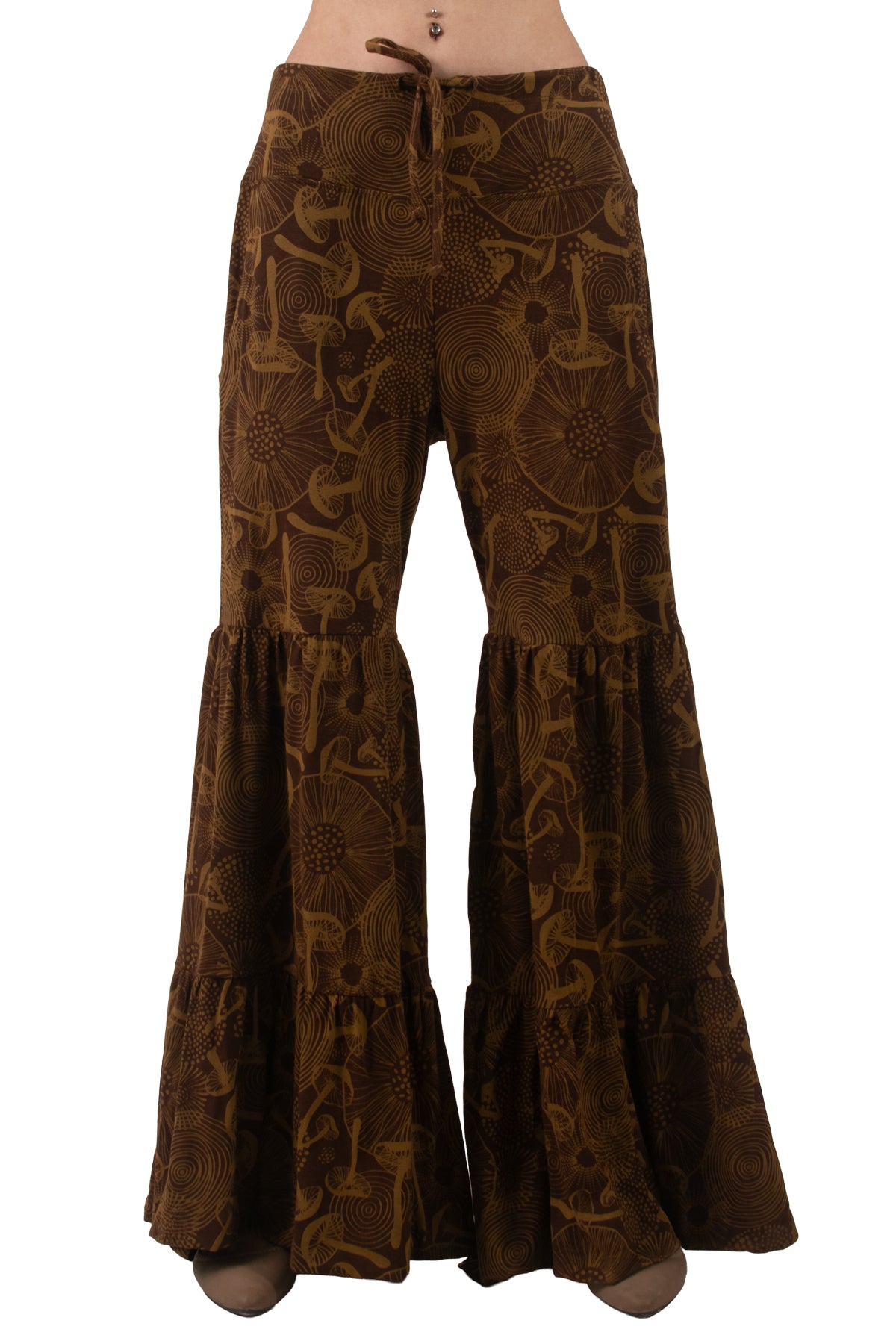 A flowy, bohemian silhouette adorned with a whimsical mushroom print. Crafted from lightweight, breathable jersey fabric, these pants offer a comfortable fit with an elastic drawstring waist. Their tiered design creates a flattering shape with added volume, perfect for casual outings, festivals, or lounging. Available in earthy tones, these pants combine style and ease, making them versatile for various occasions. Pair with a simple top or crop for a relaxed, chic look.