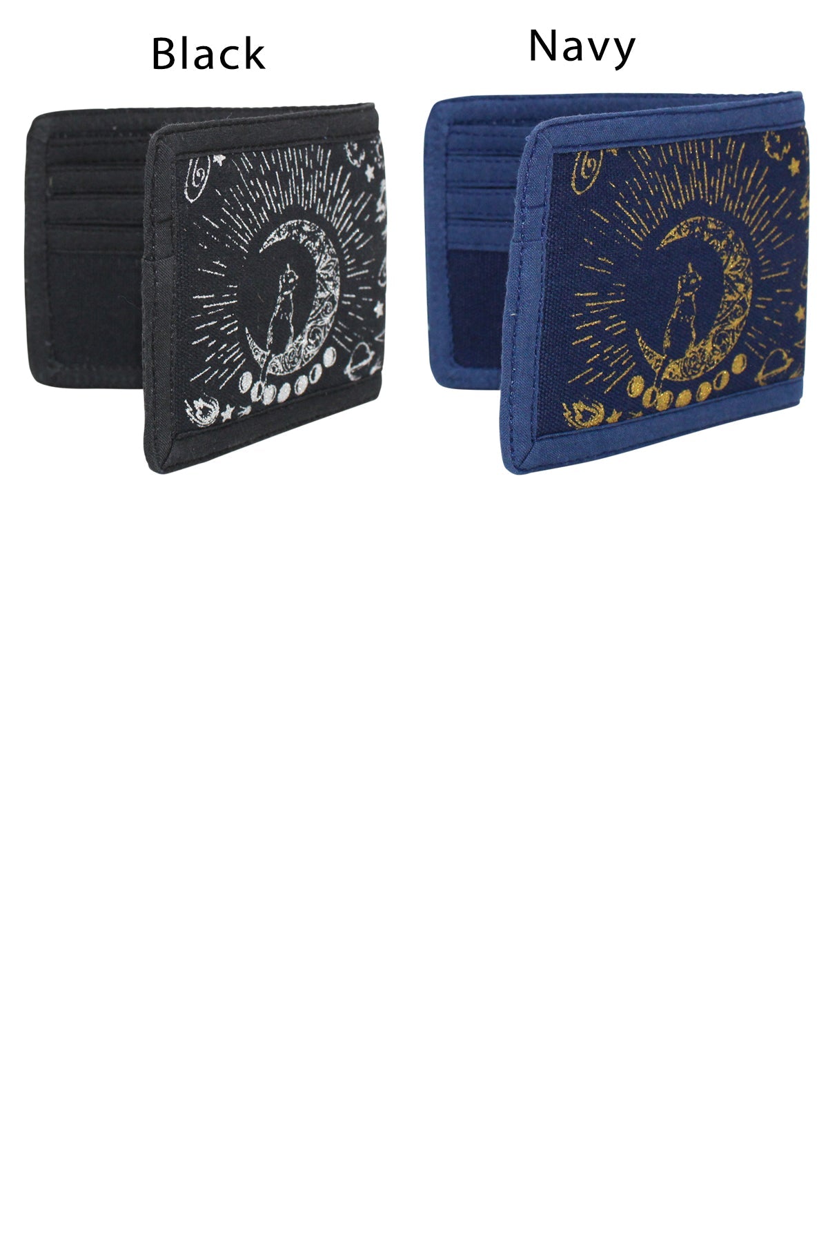 A charming canvas wallet featuring a celestial-inspired cat and moon design. With durable cotton construction, piped edges, and practical interior pockets, it’s perfect for keeping your essentials organized while adding a touch of cosmic style.